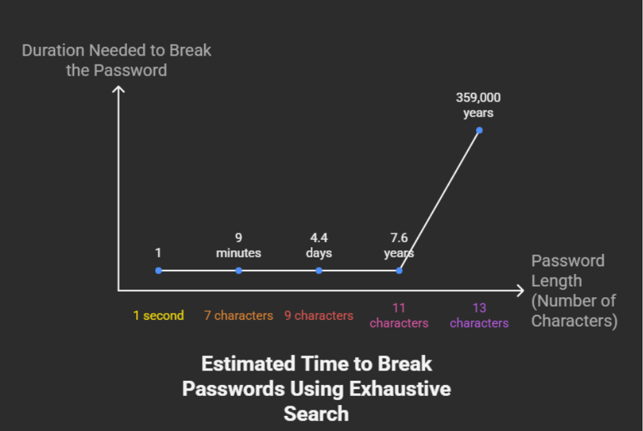 If the target string is sufficiently long, then it could take a brute force attacker days, months, or even years to decode a properly randomized password. As a result of the current trend of requiring longer passwords and encryption keys, brute force attacks are quite a bit more difficult. When good passwords and encryption are utilized, attackers typically try other methods of code breaking such as social engineering or on-path attacks.