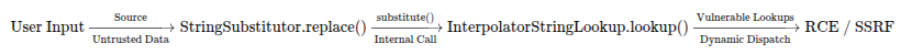 interpolator.replace(search)call is the Sink. This method, when called on aStringSubstitutorobject created withcreateInterpolator()in a vulnerable version, initiates the dangerous string substitution. - Exploitation: An attacker sends a request like
