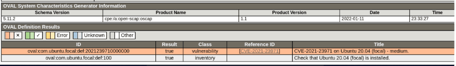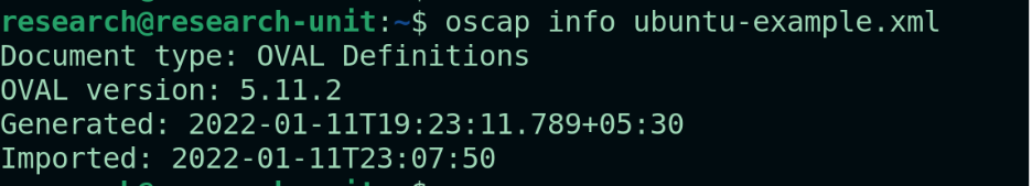 - Validate the definition file to check if the file complies to SCAP standard oscap oval validate ubuntu-example.xml